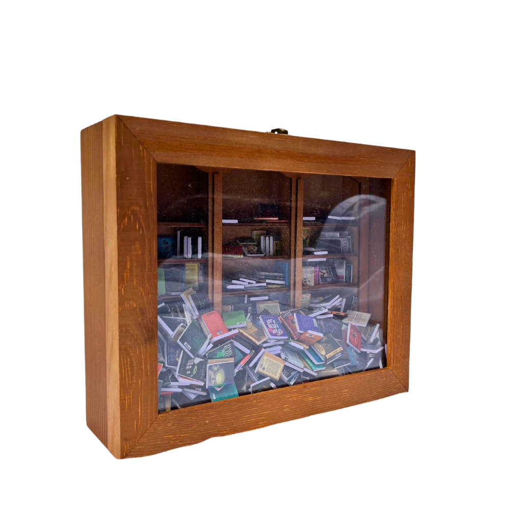 Kézzel készített fából készült könyvespolcunk kielégítő módja a szorongás oldásának. Miután elrakta a minikönyveket, csukja be a vitrint és fordítsa el a reteszt. Ha a stressz visszatér, egyszerűen rázza fel a könyvespolcot, hogy minden összekeveredjen, és kezdje elölről :)
